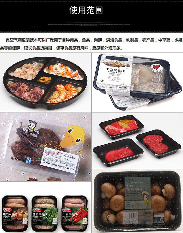 真空气调包装技术可以广泛应用于各种肉类,鱼类,海鲜,烘焙食品,乳制品,农产品,中草药,水果类等的保鲜,延长食品货架期